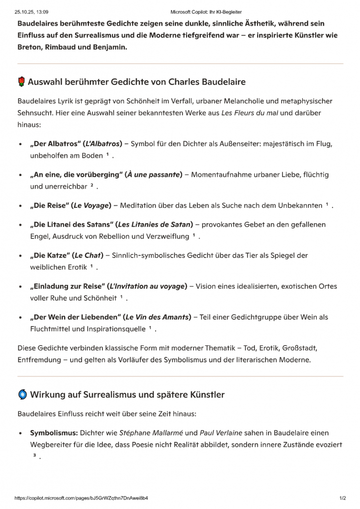 - Biografische Einflüsse: Baudelaire verband persönliche Krisen, musische Suche und eine scharf beobachtende Kritik der Gesellschaft; diese Erfahrungen spiegeln sich in seinem Schreibstil wider.